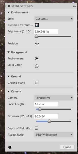 En fusión 360, selecciona la lámpara de Pixar a la derecha de la bola de colores (estos son términos técnicos). Esta es la ficha de configuración de la escena.