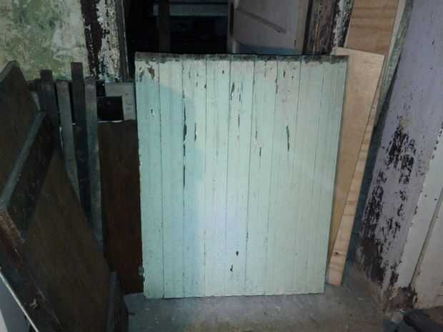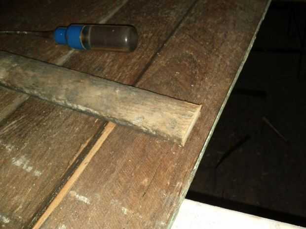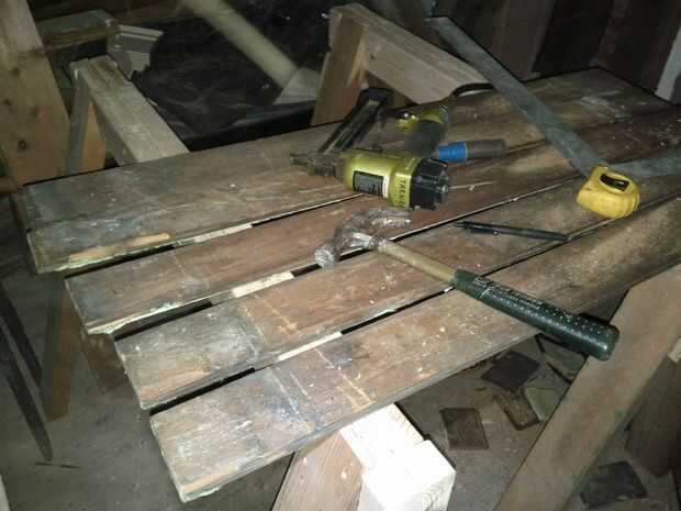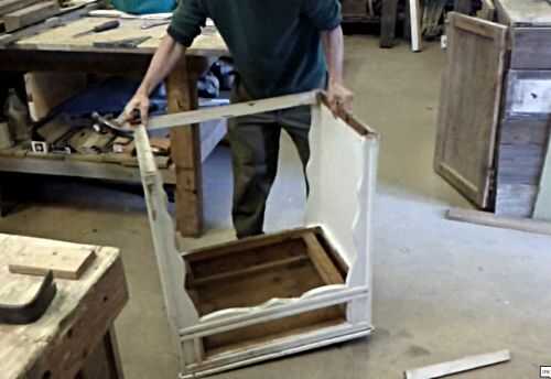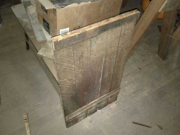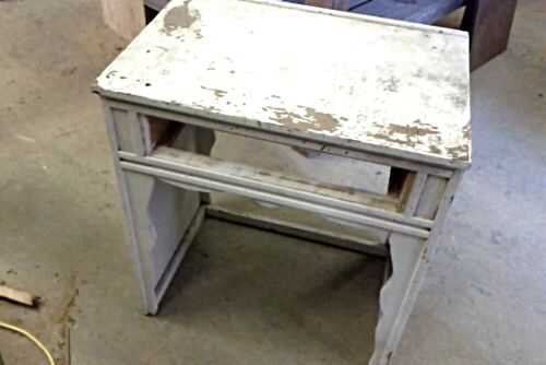 Aquí hay dos fotos del escritorio original. Se hace sobre todo de madera blanda gruesa de 3/4". Mi reproducción se realizará partir de chatarra. Los dos lados son de algún revestimiento beadboard, la parte superior es la puerta de un gabinete viejo grande, las piernas onduladas decorativas son de una antigua plataforma de hojalatería, hay planchas de madera allí y brad viejo listones, pegamento y 1-1/4" calibre 18 clavos. Mi pistola de clavos poco hizo esta locura todo trabajo.