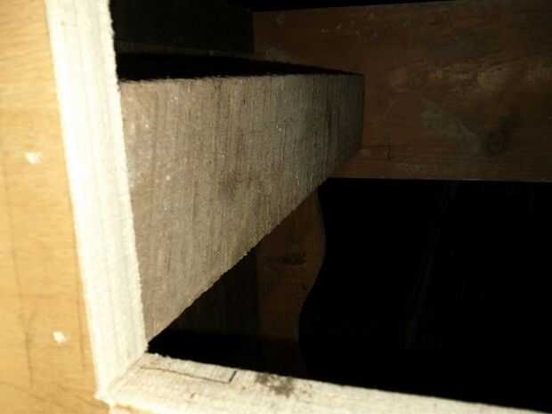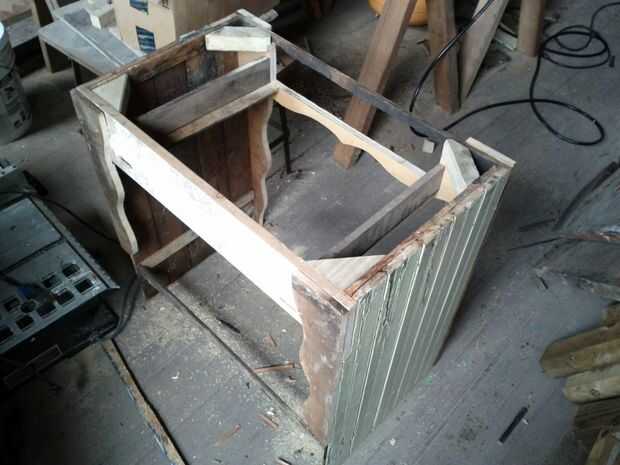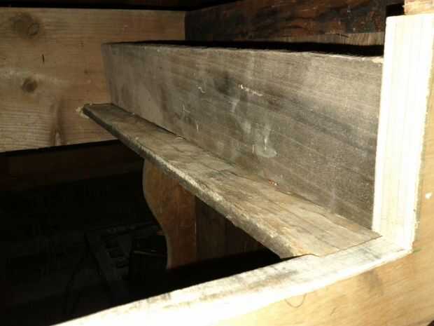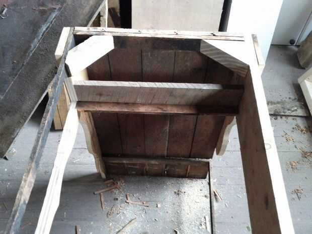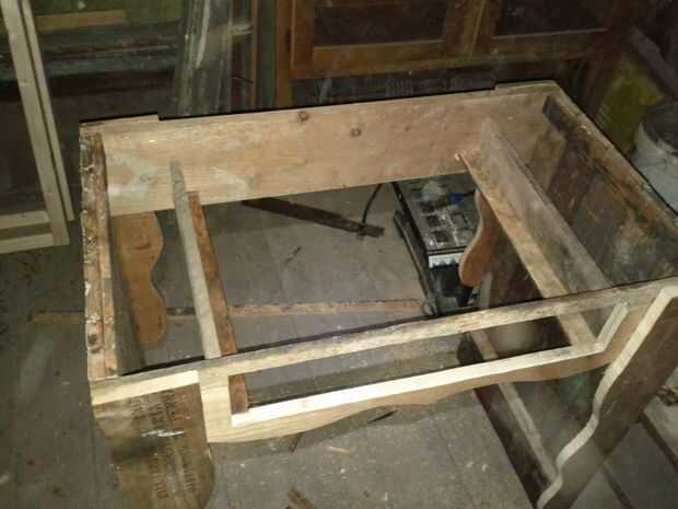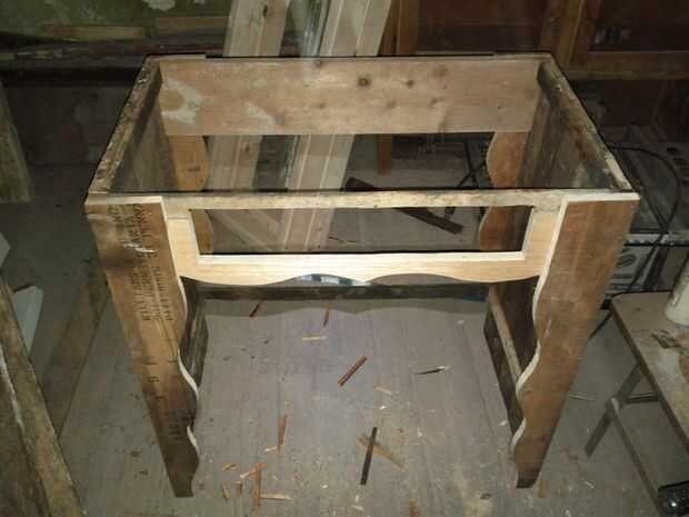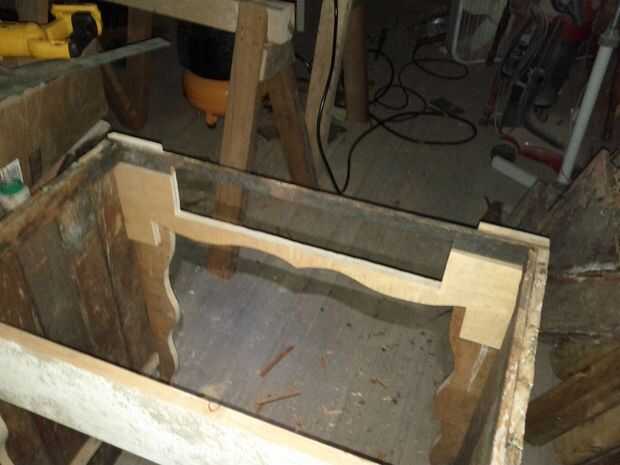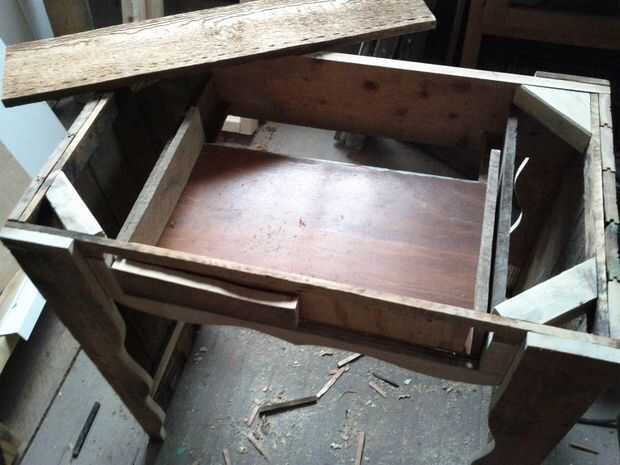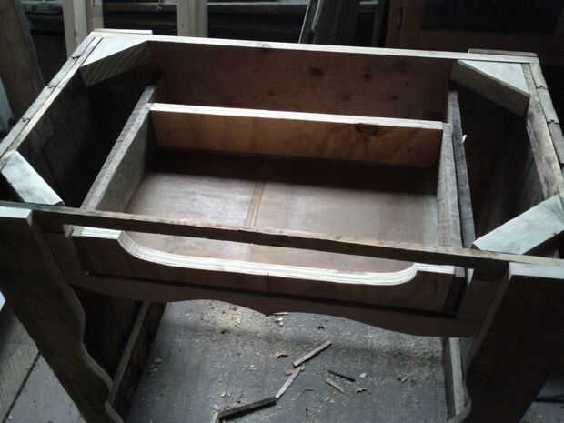 La cara de este escritorio, con un gran agujero rectangular para el cajón y un fondo decorativo, se reconstruye de un extraño corte 3/4" retal de 5 capas (clavado a la parte posterior de las patas delanteras) y el lazo superior del listón horizontal de antes. He tallado mortajas en el panel posterior de la mesa para aceptar los fondos del carril de cajón (dos tramos de listón) y clavados a los lados del riel del cajón de las caras anterior y posterior de la mesa. Tenía un montón de triángulos de x 2 en la pila de chatarra y pegado y clavado a ésos en las esquinas superiores de la administración de escritorio: voy finalmente Atornille el escritorio los brackets de arriba. Establecen algunos pedacitos de chatarra para el cajón y hecho la canal de cajón por encolado y clavado todo juntos (tenía pequeños clavitos de 3/4" para panel inferior espesor 3/16"). Corte más adelante la cara frontal de la gaveta y adjunta a la parte delantera de la bandeja de cajón que ver aquí. No de la manera más elegante para construir un cajón pero con suficiente cera en los carriles lo debe deslizarse bien. Hice el cajón un poco sobredimensionadas (12,25" profunda en lugar de profundidad máxima de 16,5"), por lo que redujo a dos clavijas para usar como paradas en los lados del carril de cajón, para que se Haz empujado el cajón en el escritorio demasiado.