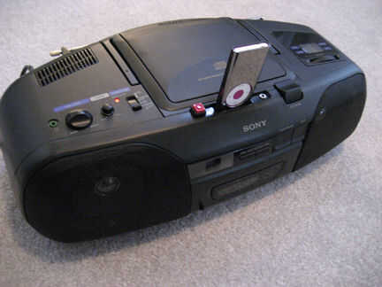 Empecé con un Sony CDF-8, una cinta de cassette de combo de vieja escuela, CD, AM / FM radio boombox. Lo que quería al final es una base para iPod integrada que recargar el iPod y reproducir a través del conector de acoplamiento Audio Line Out. Quería añadir un compartimiento donde la vieja cinta mecanismo residió. Por último, también tengo un Motorola SLVR L7 iTunes así que quería añadir a un conector auxiliar de línea en.
