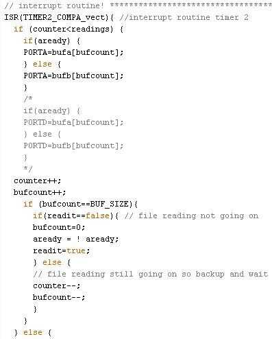 Si todavía está leyendo la tarjeta SD tenemos que seguir una lectura (contador--; bufcount--;) y salir de la interrupción a intentarlo más tarde. (Clic en la señal de salida de audio implica que esto ha ocurrido).