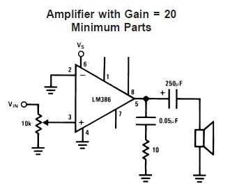 Manual del amplificador proporciona un mínimo de piezas diagrama, proporcionando una ganancia de 20 (demasiado para nosotros- pero tiene un control de volumen).