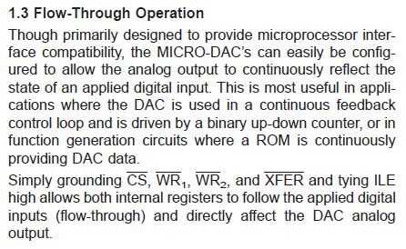 Simplemente tierra CS, WR1, WR2 y transferencia y atando ILE alta permite dos registros internos seguir las entradas digitales aplicadas (flow-through) y afectan directamente a la salida analógica del DAC.