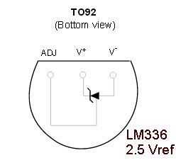 - Consulte el diagrama de la vista base de la referencia de tensión LM336. La pata de ajuste no se utiliza y se puede cortar.