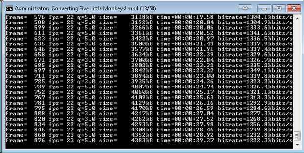 Ahora sólo tienes que esperar. Una pantalla negra de DOS subirá como convierte el vídeo, fotograma a fotograma en el formato adecuado. Dependiendo de la velocidad del ordenador y la cantidad de videos que está convirtiendo esta podría tomar desde 5 minutos para un video clip solo hasta horas para varias películas de la longitud total. Ser paciente.