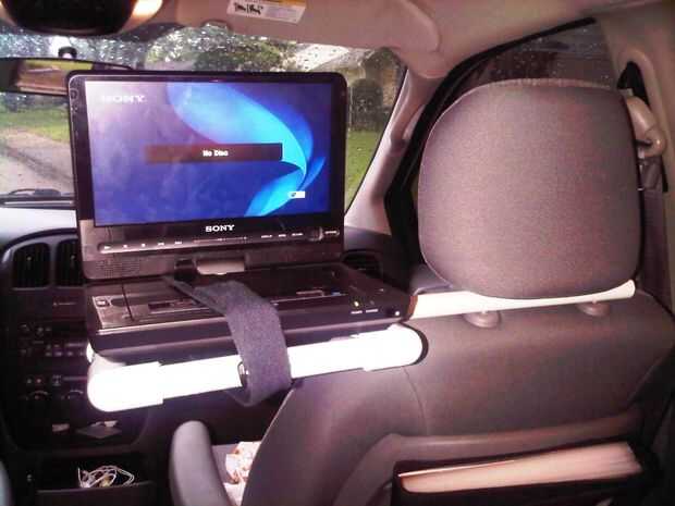 El Monte llevará a cabo el reproductor de DVD horizontalmente, con el reposacabezas del coche para mantener en su lugar. Que mina para el reproductor de DVD al lado en vez de directamente detrás del asiento para que mi hijo no podría alcanzar el reproductor de DVD de su asiento de coche o retroceso tiene construido.