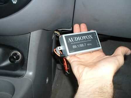 he instalado un modulador de FM que se oculta detrás del panel de control y se conecta directamente a la antena y la potencia, en contraposición a uno que cuelga desde el encendedor de cigarrillos. Sólo seguí las instrucciones de instalación que vinieron con él. Moduladores de FM de este tipo tienen un interruptor on-off para la antena, que puso en un lugar discreto debajo de la rueda de manejo.