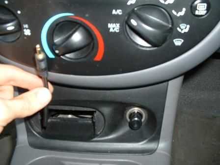 Hay dos conectores RCA que salen del modulador. Yo con un cable que se adapta a los conectores RCA a un conector estéreo de 3,5 mm había extendido. El enchufe de la estereofonia entonces fue tirado a través de la abertura para el cenicero.