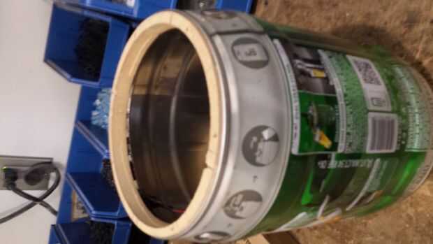 Una vez vaciado el barril mini, perfore unos agujeros en la cara para asegurarse de que la presión de aire está fuera de él. Cortan la cara, haciendo que usted tenga al menos 1/4" de labio a la izquierda. Tenga cuidado con los bordes afilados cuando se lave el interior y exterior muy bien con agua y jabón. Usé cinta aislante para cubrir los bordes mientras que trabajaba en el interior así no lastimo a mí misma. No olvide quitárselo cuando estás a punto de cerrar la caja del auge.