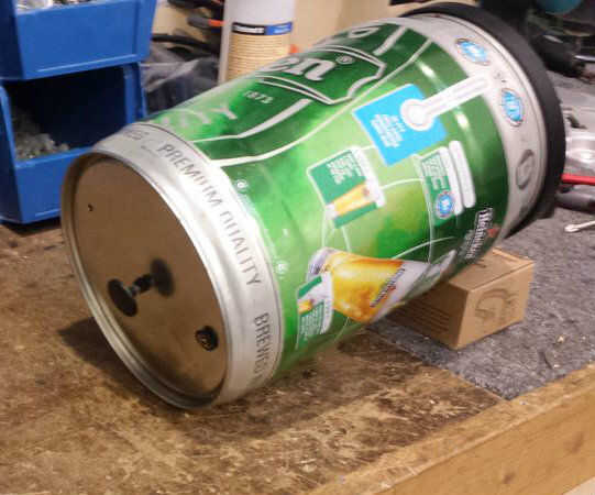 Para las piernas, utilice los 2 tornillos y 4 tuercas. Una tuerca en su interior y una tuerca en el exterior de la pared del barril. Lo mismo para la otra pierna. Sólo había conjeturado aproximadamente 1 1/2" a 2" aparte del pliegue de la parte inferior y en orificios perforados y agregó. En retrospectiva, hubiera coloqué un poco más en dirección del pliegue.