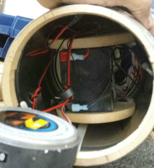 Luego conecte la extensión de Aux y añadir pegamento a los bordes madera de MDF de la Amp y por encima de la batería. Asegúrese y mantenga los tapones de altavoz, donde se puede llegar a ellos para conectar al altavoz.