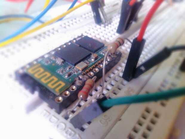 3. después de conseguir el derecho de pasadores, encienda el módulo mediante la conexión de 3, 3V y tierra al pin de Vcc del módulo y pin de tierra respectivamente. Tu teléfono Android sólo recibe datos, por lo tanto necesitamos solamente pin Tx del Arduino al pin Rx del módulo. Por favor siga el divisor del voltaje correcto o puede ver el mágico humo blanco aparecen unos. Yo uso 220 ohmios y 1 k ohmios.