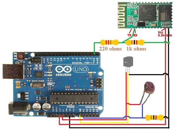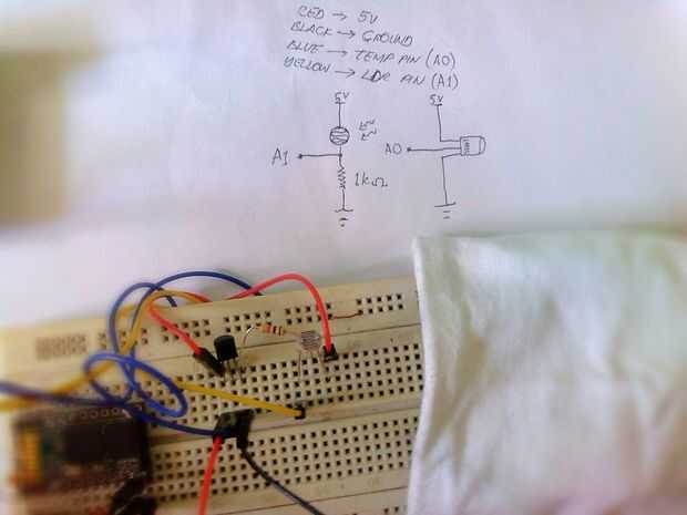 5 Conecte el pin de señal del LM35 a A0 de Arduino. Para LDR (resistor dependiente de luz), no necesita preocuparse por las clavijas, resistor del ohmio de la resistencia 1k (marrón negro rojo) para conectar a tierra y LDR un perno a la resistencia de ohmios 1 k, mismo pin de LDR donde resistor del ohmio 1 k conectado, conectará este nodo a A1 de Arduino y el otro pin del LDR a 5V. El circuito está en la fotografía.