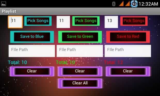 2. toque en agregar canciones botón, aparecerá otra pantalla y sirve como editor de lista de reproducción, pulse escoger canciones para recoger y guardar en Xcolor para ahorrar. También es un claro local y global, si desea borrar los datos en la base de datos. Cada selección de canción se guardará para incrementar el número o canciones en la lista de reproducción.