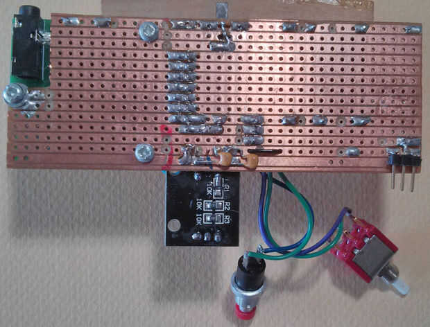 El desglose de codificador rotatorio tiene 5 pernos. Extraer pista de tablero de Vero donde los pernos de segundo y cuarto se vaya y adjuntar el desglose de codificador soldando los pernos primeros y quinto. Los condensadores de 100nF necesitan estar conectado entre tierra y los pines CLK y DT del codificador. También usé un condensador de 100nF entre su + y GND conexiones (visibles en el paso siguiente), sin embargo, esto probablemente no es necesario.