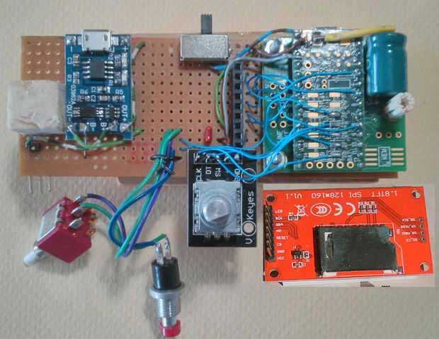 La batería cargador tablero y alimentación conmutador de deslizamiento están montados en la parte superior del tablero de Vero como se muestra. Como se describe en http://pjrc.com/teensy/pinout.html, se corta el rastro entre VIN y VUSB en el Teensy. El interruptor deslizante conecta VIN o VUSB y el pin OUT + del cargador. Hacia fuera-de que el cargador está conectado a tierra.