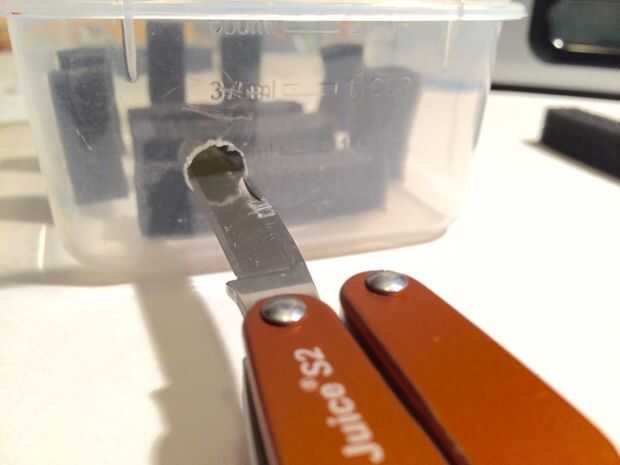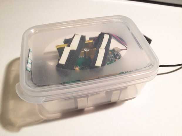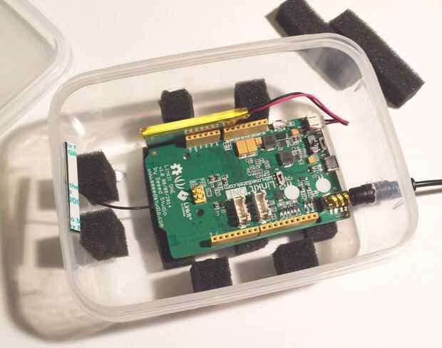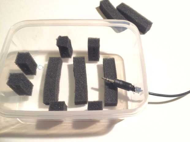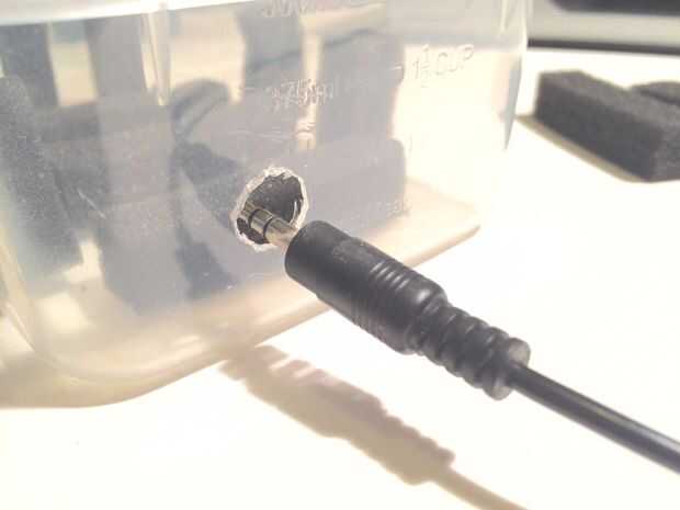 Seleccione un caso plástico que quepa Linkit uno bien. Mi antena wifi y batería caben fácilmente en el caso de la Junta. Usé algunos espuma de otro caso para proteger el tablero de cualquier empujones. Usé cinta de doble cara para pegar la espuma hacia abajo. Luego marqué donde el agujero para el cable de audio iría colocando el tablero dentro de la caja. Usé un cuchillo para hacer el agujero en el caso. (ADVERTENCIA: cuchillos afilados son así que ten cuidado) Entonces puse todo en el caso para asegurarse de que cabe.