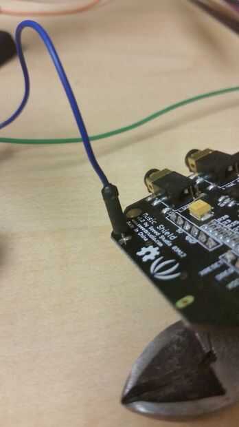 Si están aderezando las cosas entonces empezar por doblar el pin "VU" arriba y fuera del camino en el escudo. Este es el cuarto pin de la derecha en el lado con los botones y corresponde al pin de "3" en el Arduino. Si tienes que conectar tu propio conduce al interruptor hacer antes de proceder.
