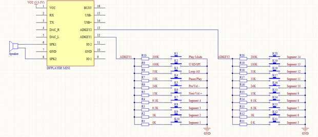 A través de la salida de ADKEY_1 puede colocar varios botones. El mp3player sabe bruja acción a tomar, debido a la resistencia que se coloque. Si se coloca una resistencia de ohm k 33, el botón será reproducir/pausar la música.
