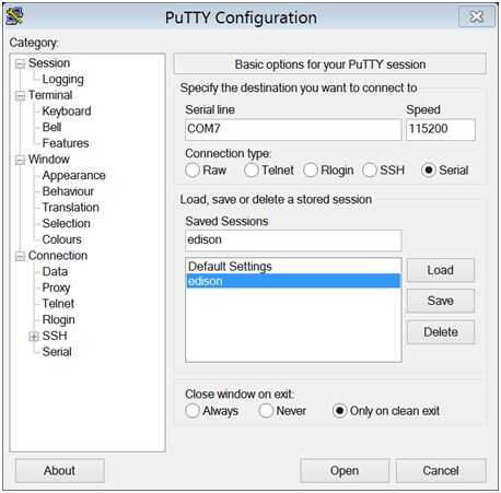 Windows Descargar y abrir el programa putty.exe, escriba el puerto COM plano obtenido en el último paso (sería como en la imagen de arriba, pero el número siguiente probablemente cambiará);