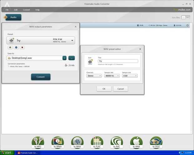 Cuando la charla es sobre el software, este es el lugar para hablar sobre el formato de archivos de música. Deben ser tipo de RIFF-WAV. Estos archivos pueden crearse por el uso del convertidor de audio de código abierto agradable "Freemake". En la fotografía se muestran la configuración del archivo de salida. Usted puede convertir sus archivos de MP3 de WMF sin problemas. Deben guardar todos los archivos en la raiz de la SD o en la carpeta llamada ''wav''. Yo sugeriría que para la prueba debe utilizar la tarjeta SD que contiene sólo los archivos de wav.