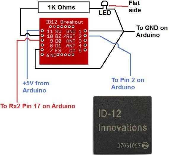 Los pines 1, 10 (a través de una resistencia y LED) y 7 en el tablero de arranque ID-12 están todos conectados a un pin GND (cualquiera es suficiente) en el Arduino.
