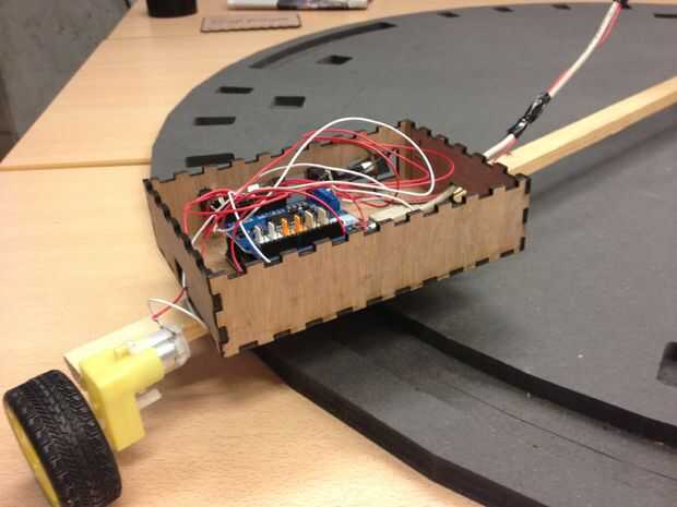 4. Mida la longitud entre las dos pistas. Esta cantidad te da una idea de cómo colocar el potenciometro, y cuán grande será su caja. Ahora diseñar un cuadro con sus dos potenciómetros que se pega fuera de la caja. En el cuadro tiene el Arduino y los cables de puente, junto con un escudo del motor y su cable USB. Usamos el escudo del motor para mover por supuesto la caja junto con la viga.