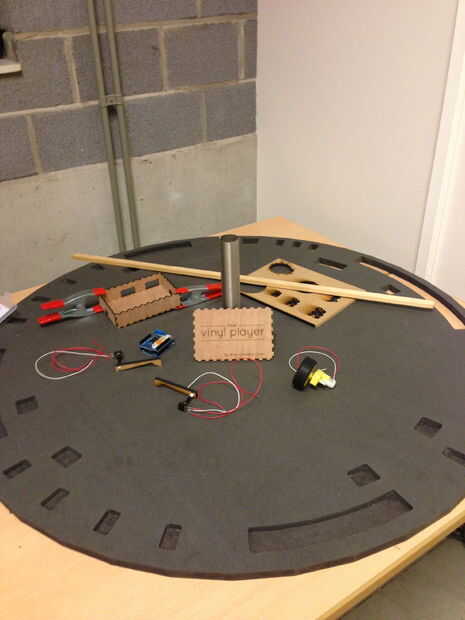 Este reproductor de vinilo grande con Arduino reproduce sonidos dependiendo de las partes superiores / inferiores en el vinilo (tablón de madera). La diferencia en la altura se mide con un potenciómetro. Eres libre de modificar el proyecto que usted desee.