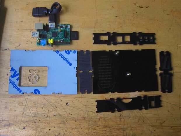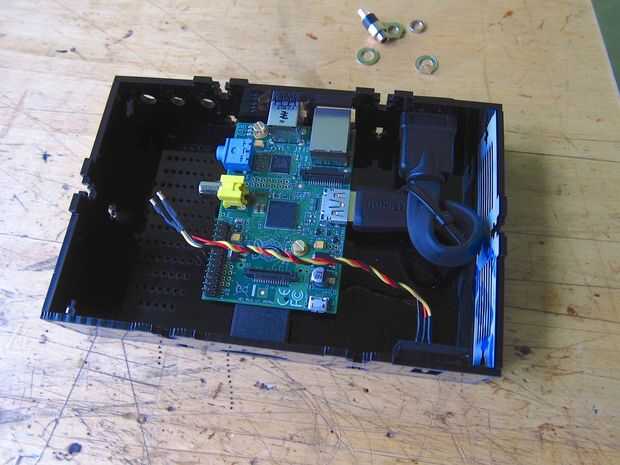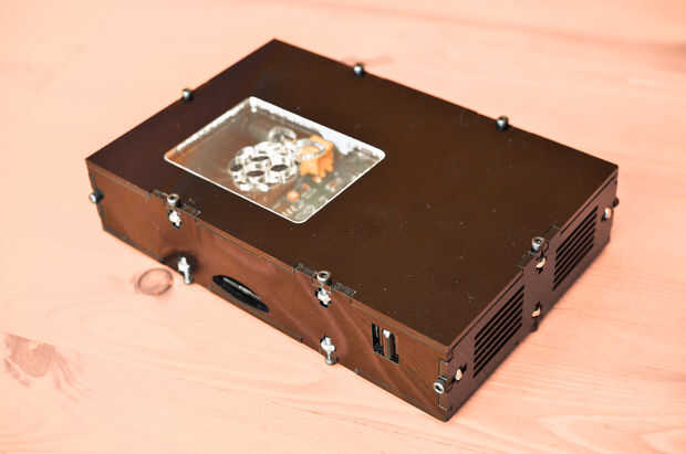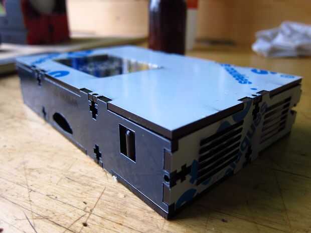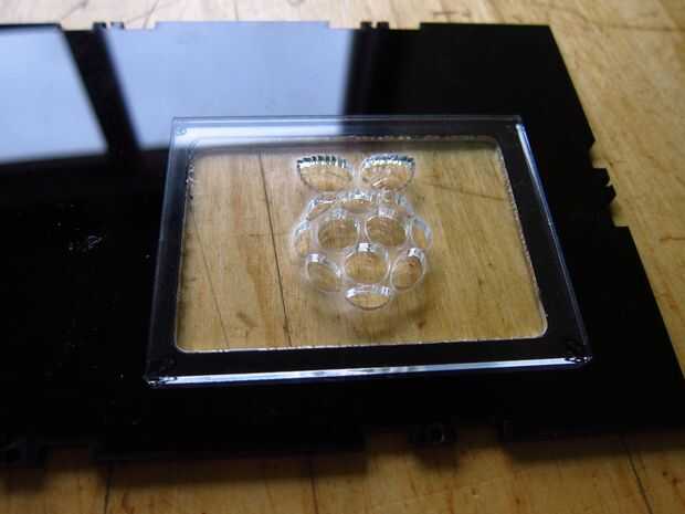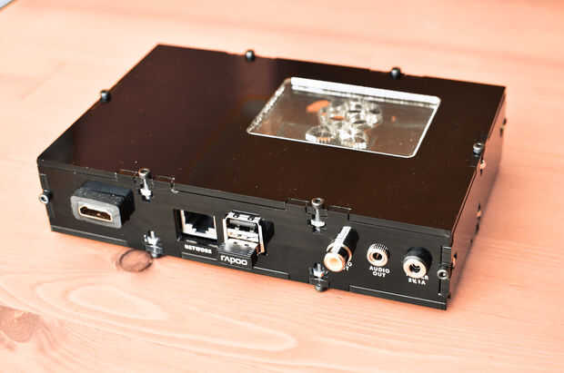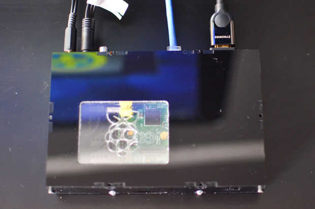 Me corte el logotipo de frambuesa de un acrílico transparente y una 'ventana'. En la parte delantera hay una abertura en caso de deba quitar la tarjeta SD e inserta un receptor IR. Puedo controlar el reproductor con una aplicación móvil, pero es solo bueno si puedo utilizar mi mando a distancia Logitech multipropósito.
