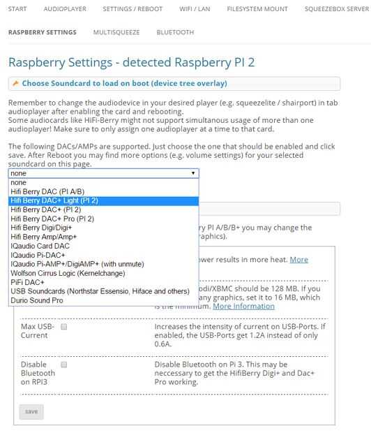 Una vez guardado, la tarjeta de sonido se puede establecer como una salida de audio para cualquier reproductor en nuestra imagen de Max2Play. Aquí, en la configuración de frambuesa, podemos decidir también si queremos que la salida de frambuesa Pi que la toma de audio o el puerto HDMI. Se especifica automáticamente para utilizar el puerto HDMI sólo cuando esté conectado, que es ideal ya que queremos usar a la conexión de audio que es predeterminado.