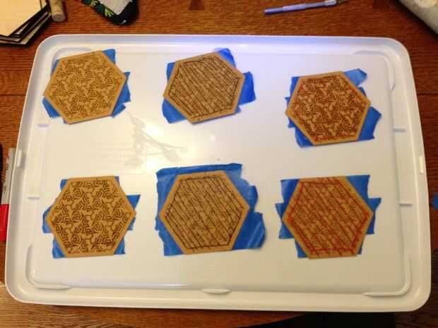 Después del corte, use cinta azul para sujetar cada pieza en su lugar. Voltee las piezas y únicamente cada uno con marcador color así que usted puede decir que es que de la parte posterior. Aquí mi chapa es de papel respaldado por lo que tienen el mismo aspecto de la parte trasera. Es especialmente importante marcarlos porque no puedo decir que es de la parte posterior. (esta imagen es BACK up (la cinta azul mantiene todas las piezas juntos.).
