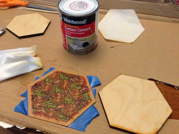 - Con cuidado aplicar 2 capas finas de cemento de contacto en la parte superior del sustrato y a la parte inferior de la chapa. Usé una toalla de papel para ello.