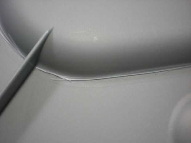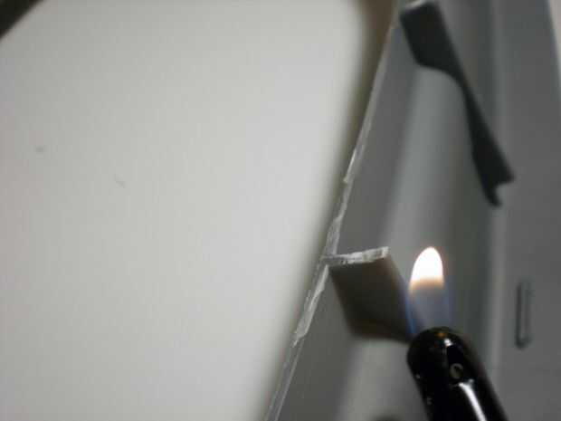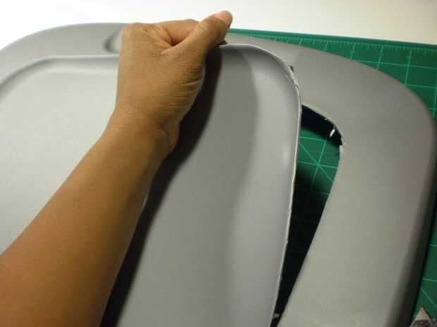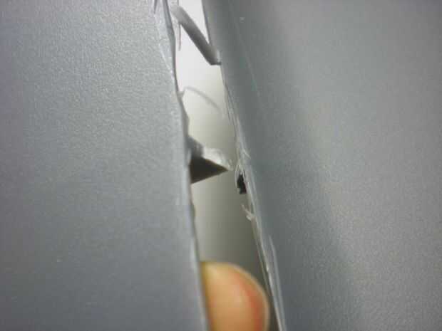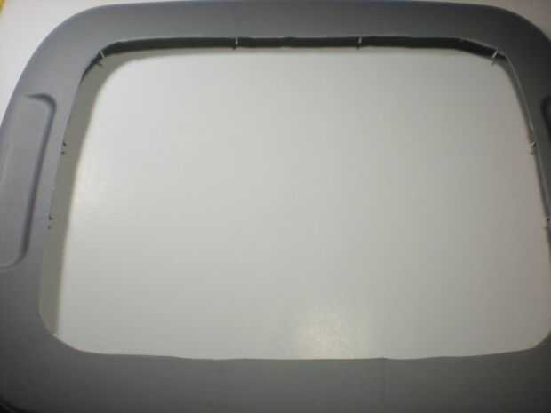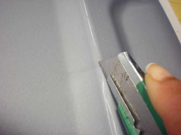 Flip su tapa en la parte inferior. Con su cuchillo, empiece a cortar las líneas de borde. Es más fácil hacerlo en secciones, como de articulación a articulación como se muestra en la imagen. Esto tomará unos pocos pasos. A anotar en la primera pasada, para que el cortador no alejarse demasiado. El siguiente pasa pocos el cuchillo irá más profundo. Voltee la tapa si es necesario y cortar desde la parte delantera para ayudar al plástico separado. Use sus manos para ayudar a tirar el plástico aparte.