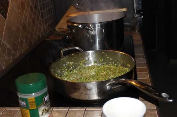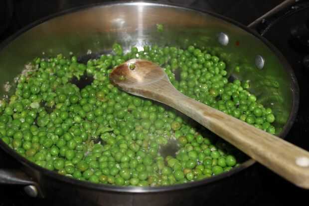 Cuando guisantes empiezan a cocinar, les aplastar con la cuchara y saltear los ligeramente.