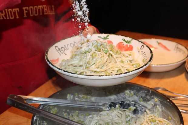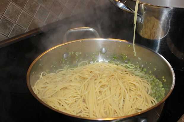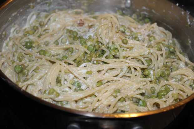 Agregue un cucharón lleno de agua a la mezcla de arvejas. Una vez cocinada la pasta, sacar pasta del agua hirviendo y colóquelo en la sartén con los guisantes.
