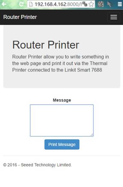 Ahora, puede conectar el Linkit 7688 Smart Wifi AP y mylinkit.local:8000 de entrada o tu IP local 7688: 8000 en tu navegador web y usted puede consulte la página de web de impresora Router como siguiente muestra. Entrada en el cuadro de texto y haga clic en imprimir mensaje y encontrará la impresora puede imprimir.
