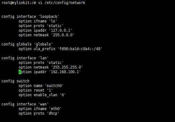 config interface 'lan' option proto 'static' option netmask '255.255.255.0' option ipaddr '192.168.100.1'config interface 'wan' option ifname 'eth0' option proto 'dhcp'
