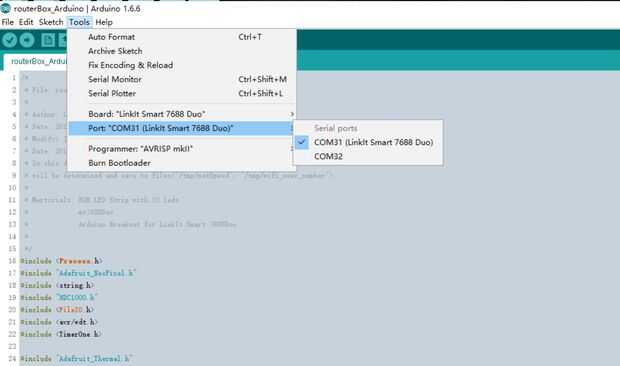 6. Haga clic en Herramientas = >deltablero y seleccione "Linkit Smart 7688 Duo" y eligió el puerto correcto, como se muestra en la imagen siguiente.