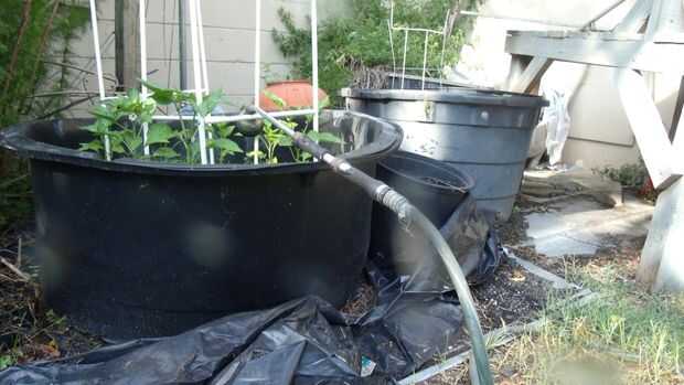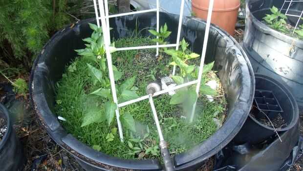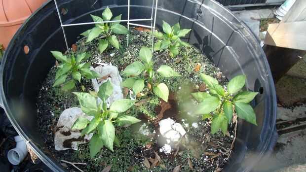 con los recipientes más grandes añadir capas un par de latas de aluminio y luego usar una mezcla de suelo comprado y hojas compostados etc. llenarlo y luego añadir mis plantas (sobre todo pimientos picantes)