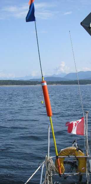 El propósito del poste marcador es para verse en ondas de varios pies de alto. Normalmente el Polo se vende con el código de bandera "O" ("hombre al agua") en una cubierta. Mina fue perdido y sustituido por un trozo de tela.