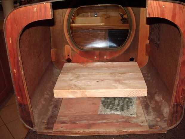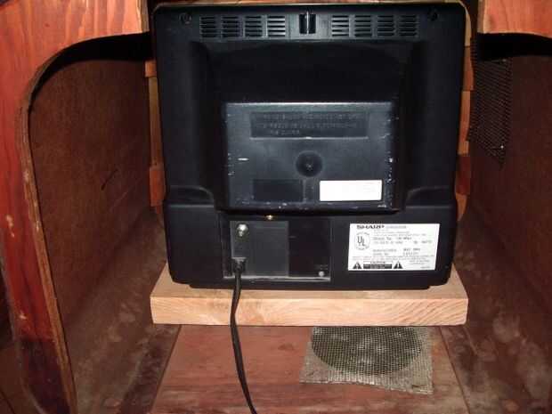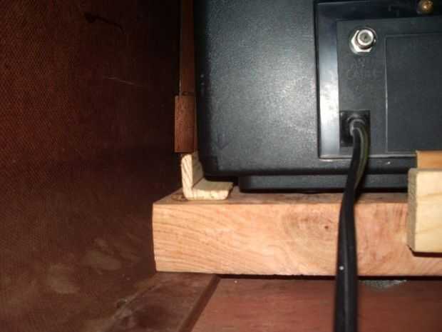 A continuación, coloca la televisión dentro del gabinete y cuidadosamente ajustado para alinear con la lente en el mueble de la tv vieja (Foto 2). Una vez perfectamente alineados, caliente pegué algunos pedazos de desecho de la madera en su lugar para evitar que el televisor se resbale de su posición (fotos 3 y 4).