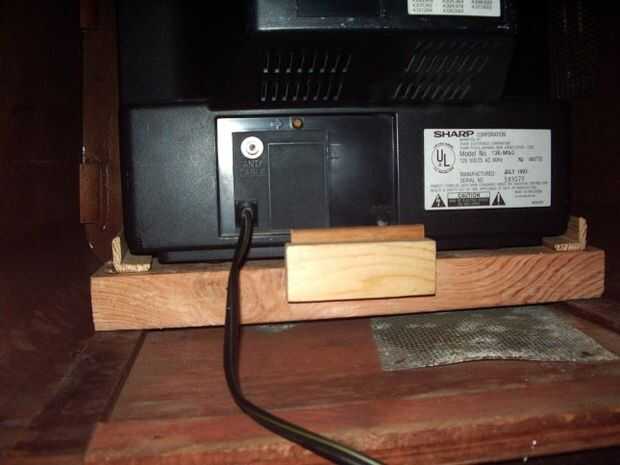 Después de algunas medidas de cuidado, vi que tengo que subir la televisión exactamente 1,75 pulgadas desde la parte inferior del gabinete. He utilizado algunas placas de desecho 2 x 6 y atornillado a la parte inferior del gabinete en el interior (Foto 1). Un pedazo grueso de 2 pulgadas de madera cepillada resulta ser 1,75 pulgadas de espesor.