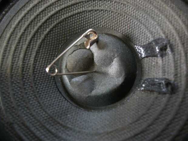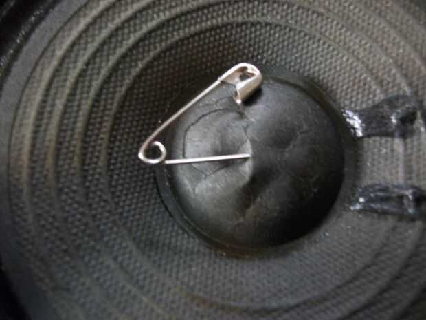 Esto es donde la aguja de coser o alfiler viene muy bien. Meter la punta de la aguja o el alfiler en la abolladura en el cono y la posición de la aguja hacia los lados para permitir a palanca/saca la abolladura. Use el pasador de aguja para obtener dentro de la tapa, uno puede empujar hacia fuera las arrugas y pequeñas abolladuras.