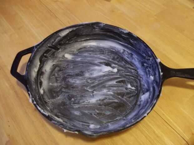 Haz una capa gruesa e incluso agradable de la grasa de elección todo el pan. Puesto que mi pan sólo tenía daños en el interior, no cubra la parte inferior de mi pan, pero si es necesario para su trabajo, una superficie (interna / externa) a la vez. Prestar atención al punto de fumar de la manteca o la grasa que usas! Manteca de cerdo puede estómago de 370ºF a 400 º f, mientras que muchos vegetales mantecas basados sólo tolerará una gama más baja, digamos de 350 a 370ºF. Utilice una grasa de punto más alto de fumar si se puede.