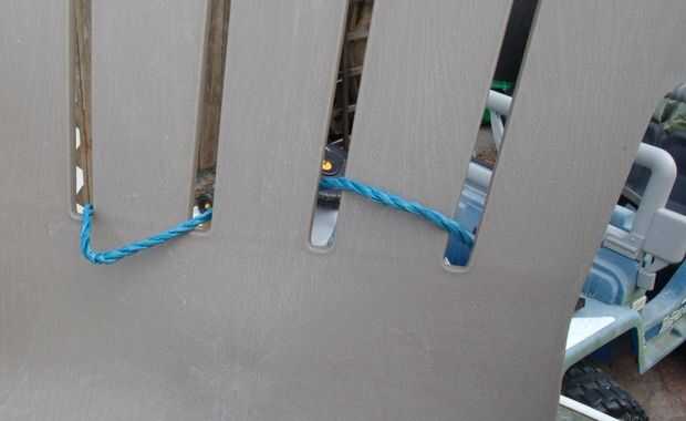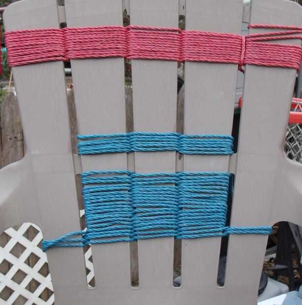 Comenzó en la parte inferior de la espalda y atado la cuerda de entonces lo dentro y fuera de las espalda "splats", tratando de mantener tanta tensión en la cuerda como posible y va a trabajarlo más apretado que he trabajado tejió. Rápidamente me di cuenta de que iba a tomar más de 2 rollos de cuerda que tenía que hacer toda la espalda, así que empecé a la segunda cuerda de la parte superior y "tejieron" abajo. Todo esto tuvo sobre una media-hora.