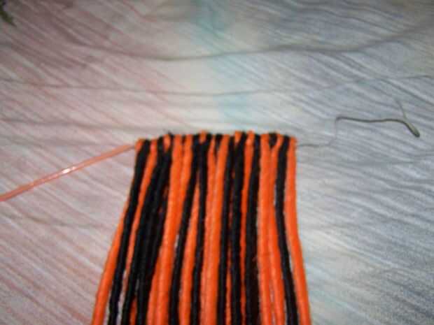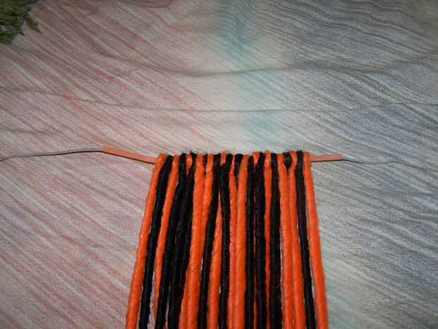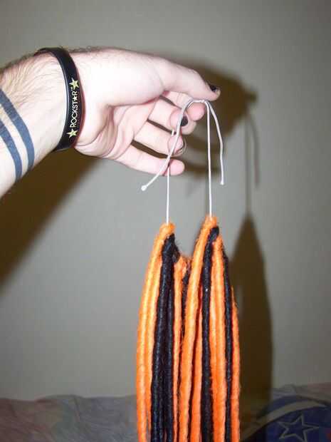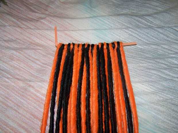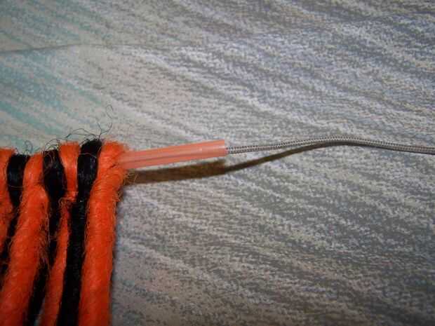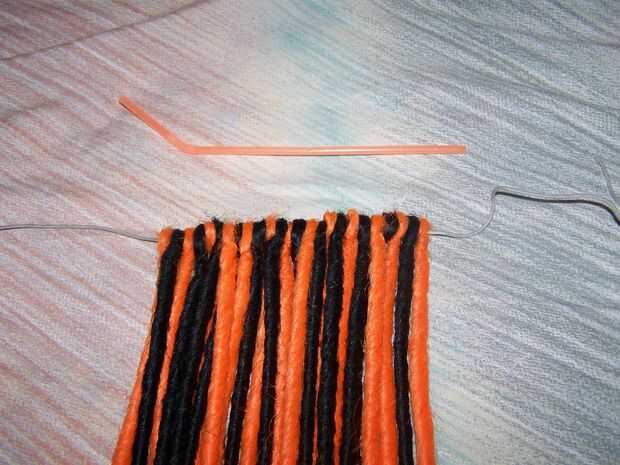 En primer lugar, tomar su paja bendy y a través de los orificios en el extremo de tus dreads, uno a la vez. Recomiendo la paja bendy para detener los temores deslizarse apagado el otro extremo de la pajilla de flexión. Una vez que tengas todos tus temores en la paja, 25 en este caso, luego tomar la cadena o cordón o lo que sea (he usado cuerdas de persianas venecianas, como he dicho antes) y pasan a través de la paja. Al llegar a la curva, despliegue, teniendo cuidado para no permitir el deslizamiento de rastas el extremo de la paja y pasar el cable, o lo que sea, todo el camino a través de la paja.