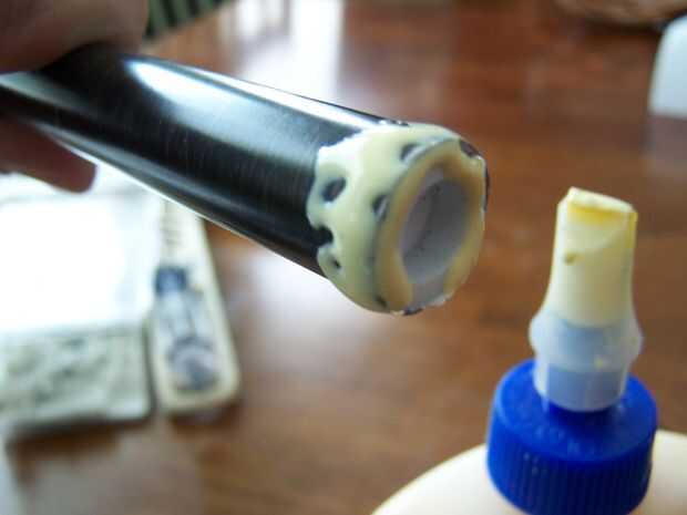 Unido a la pared el soporte de la barra primero (no se muestra) para que la varilla apuntaría hacia arriba cuando se insertan. Utilizar su pegamento favorito para que sea cómodo. Yo espera-Tite, pero sellador de silicona funciona bien también. Si usas pegamento gorila, recuerda que se expande como se seca, por lo que debe sujetarse. Sujeción no es necesario con las otras colas.