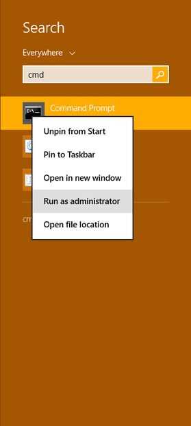 Presionar la tecla Windows y la tecla S y escriba cmd. Haga clic derecho sobre él y haga clic en "Ejecutar como administrador".