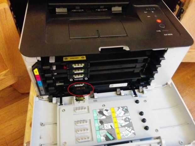 Abra la impresora y busque la unidad de imagen. En mi impresora, es en la parte inferior, por debajo de los cartuchos de tóner.