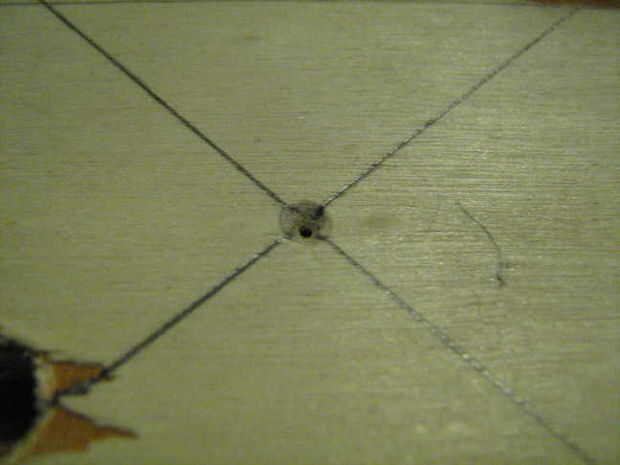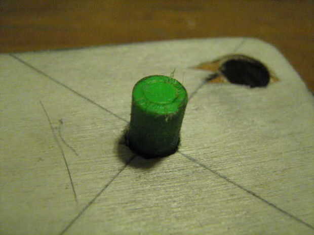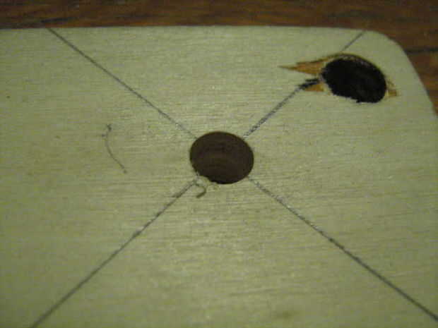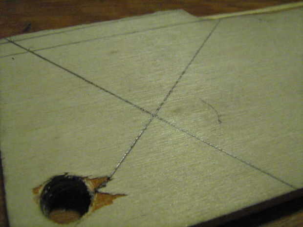 he utilizado un plano, trozo de madera gruesa de 1/4" como un soporte de plantilla para completar el ensamblaje de la cuchilla. Sólo quería tener cuatro hojas para la soldadura más fácil, así que dibujé dos perpendiculares, intersección de líneas. Taladrar un agujero piloto en su intersección y había ampliada por lo que es ligeramente más pequeño que el ancho del cilindro anterior. Necesitaba a la arena el cilindro más antes de pase por el agujero con una fuerza moderada. Por último, apareció el cilindro lo suficientemente alta para que pude fijar las palas.